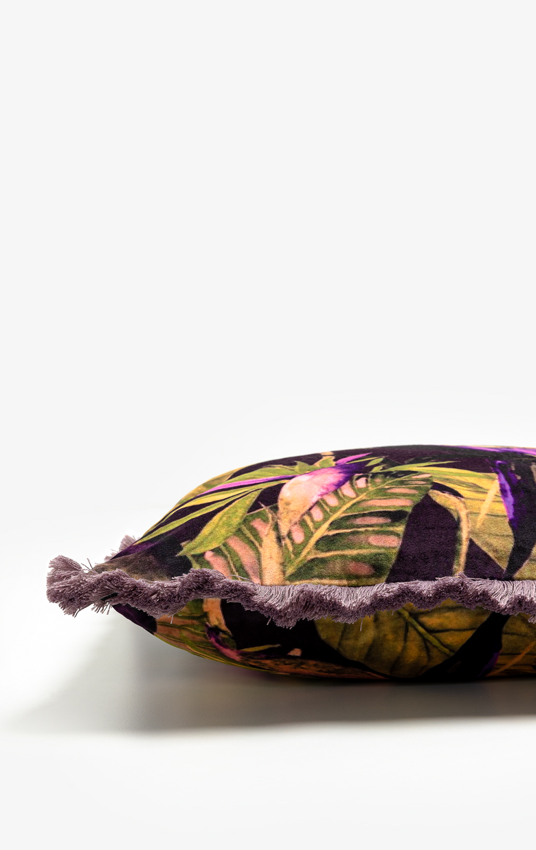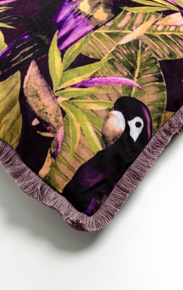 Το διακοσμητικό μαξιλάρι Papagalo είναι η επιτομή της εκλεπτυσμένης αισθητικής. Με βελούδινο ύφασμα και υπέροχο τρόπικαλ σχέδιο, το οποίο πλαισιώνουν διακοσμητικά κρόσσια, αποτελεί την ιδανική προσθήκη για να αναδείξετε τον καναπέ, την πολυθρόνα ή το κρεβάτι σας. Η αρμονία των αποχρώσεων και η πολυτελής υφή του δημιουργούν μια αίσθηση ζεστασιάς και κομψότητας, μεταμορφώνοντας κάθε χώρο σε ένα καταφύγιο στυλ και φινέτσας.