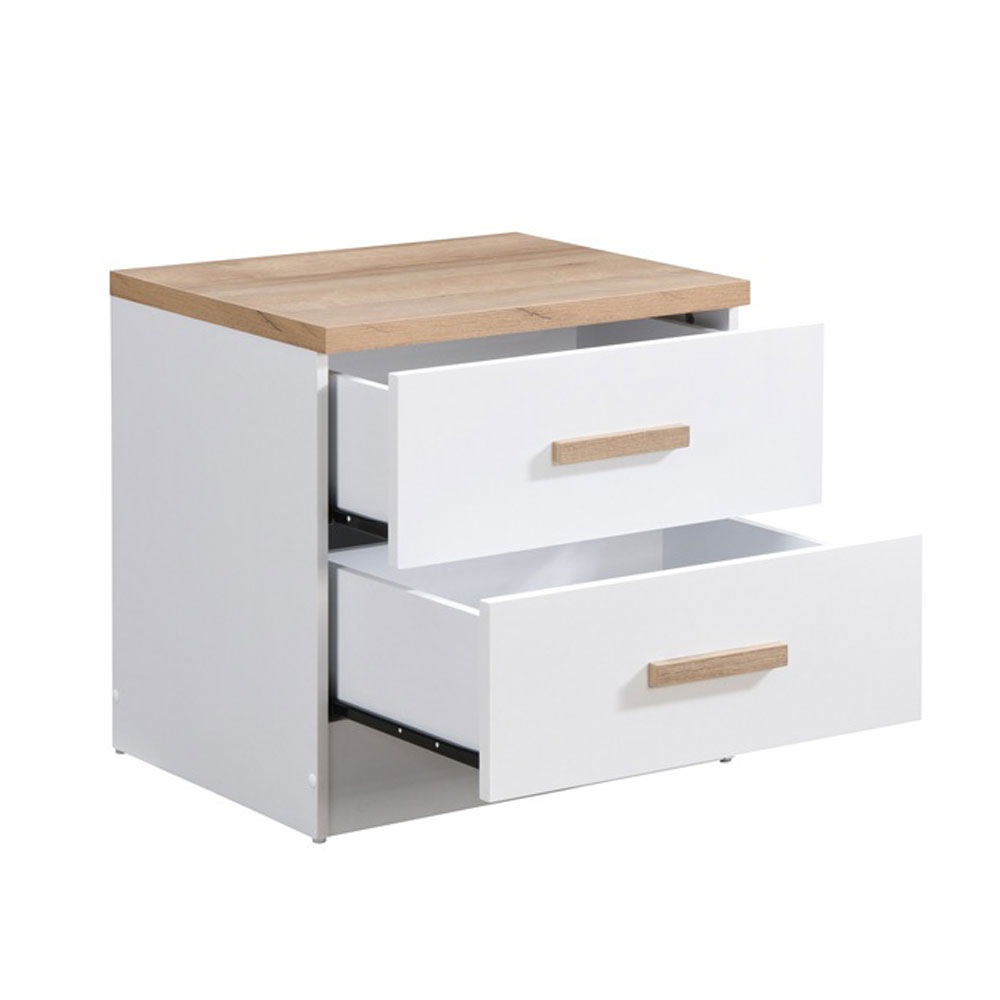 Το κομοδίνο Practico συνδυάζει την κομψότητα με την πρακτικότητα, ιδανικό για μοντέρνα υπνοδωμάτια. Κατασκευασμένο από επένδυση μελαμίνης carta σε λευκή απόχρωση, διαθέτει επιφάνεια σε φυσική απόχρωση ξύλου, που προσθέτει μια αίσθηση ζεστασιάς και φυσικής αισθητικής. Τα δύο ευρύχωρα συρτάρια του προσφέρουν άφθονο αποθηκευτικό χώρο για την οργάνωση των αντικειμένων σας. Το Practico είναι η ιδανική επιλογή για όσους αναζητούν λειτουργικότητα χωρίς να θυσιάζουν το στυλ.