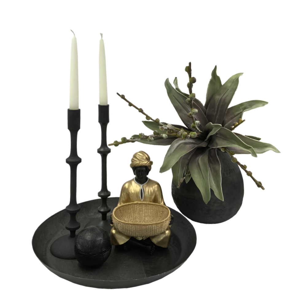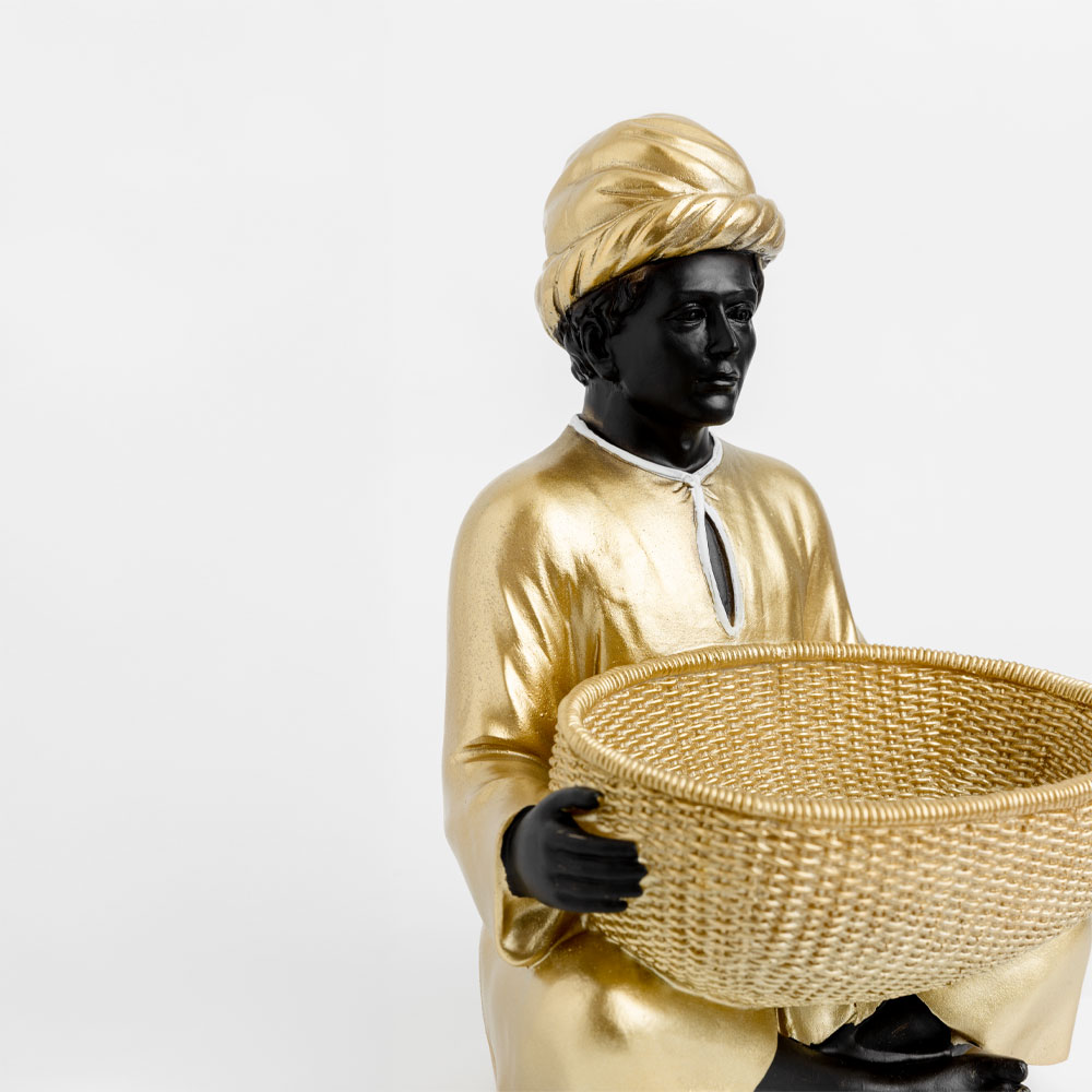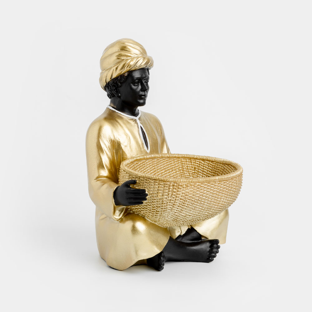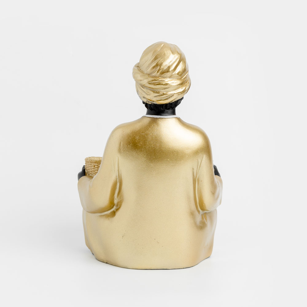 Η διακοσμητική φιγούρα VEDAS, διαστάσεων 19x18x27cm, είναι κατασκευασμένη από πολυρεζίνη και απεικονίζει μια φιγούρα σε καθιστή στάση με τουρμπάνι και χρυσή φορεσιά, κρατώντας μπροστά της ένα καλάθι. Ο συνδυασμός χρυσού και μαύρου προσδίδει αρχοντική και εξωτική αισθητική. Ιδανική για τοποθέτηση σε εισόδους, κονσόλες ή βιτρίνες, μπορεί να χρησιμοποιηθεί και ως διακοσμητικό μπολ για μικροαντικείμενα ή γλυκίσματα.